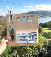 This three-in-one viewfinder tool is made in the UK from 3mm waxed birch wood in small batches. Six laser cut apertures provide a range of different viewpoints for selecting and cropping scenes and details to sketch or simply consider. Cord straps are attached to hold a small sketchbook or loose-leaf paper thus providing a firm drawing surface. Alternatively, a larger sketchbook can be clipped in place. Two expandable triple metal pen holders allow you to keep a limited palette of drawing media within reach and in sight of your sketchbook.
