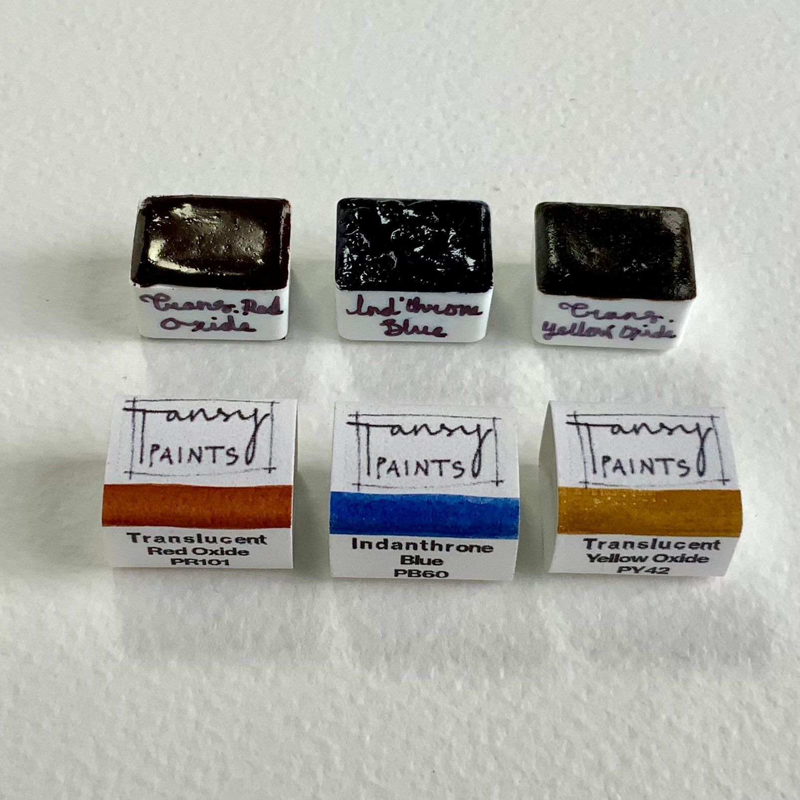 Now including (swipe for photo) our three new single-pigment primary colours: Transparent Red Oxide (PR101), Transparent Yellow Oxide (PY42) and Indanthrone Blue, PB60 (please note, 'transparent' and 'translucent' are used interchangeably for the oxide pigments.)
