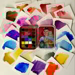 24 half pans of artist quality highly pigmented handmade watercolour paint in a vintage confectionery tin (14x10.2x2.6cm).