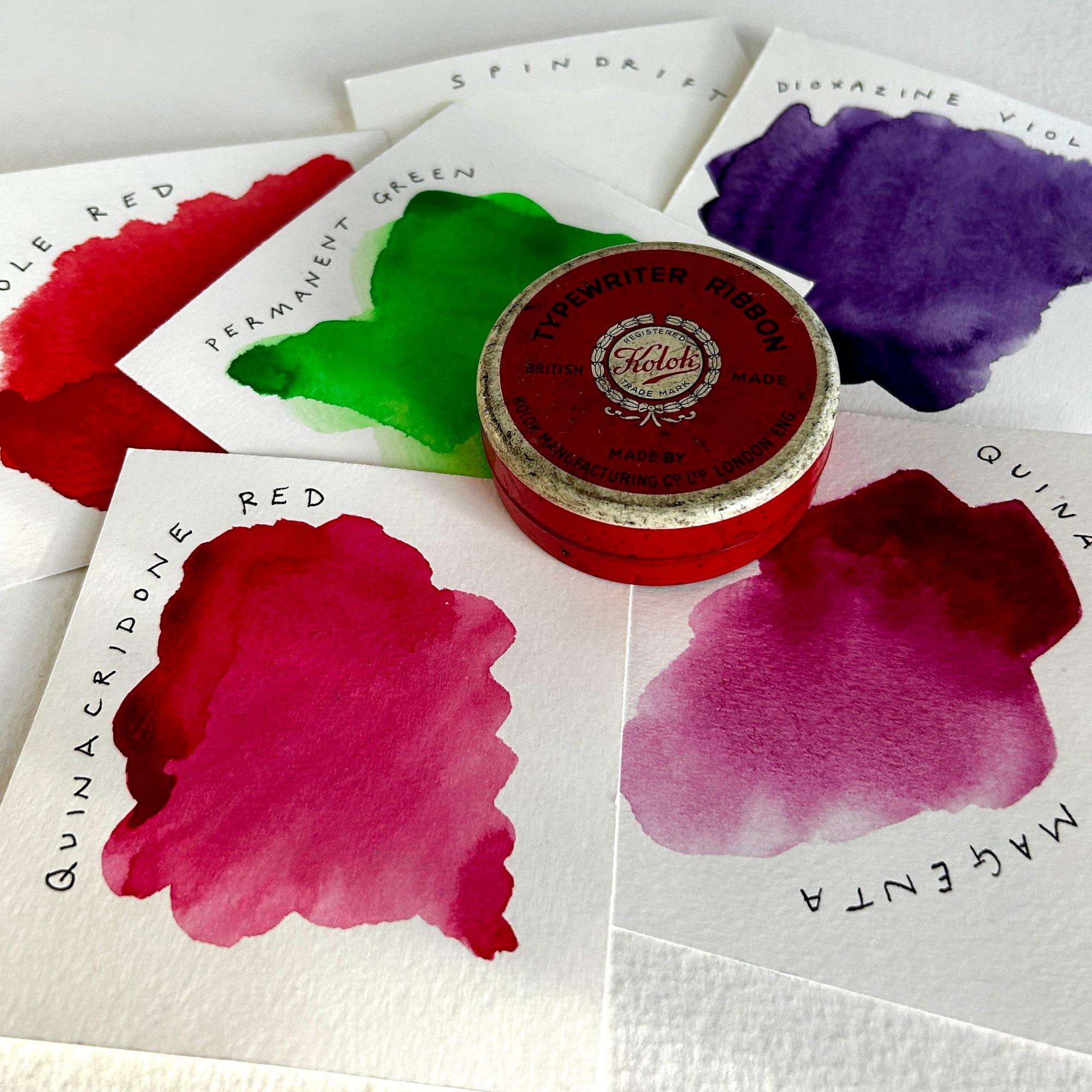 6 half pans of artist quality highly pigmented handmade watercolour paint in a vintage typewriter ribbon tin (6.5cm Diameter, 2.3cm Height).