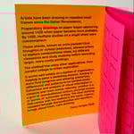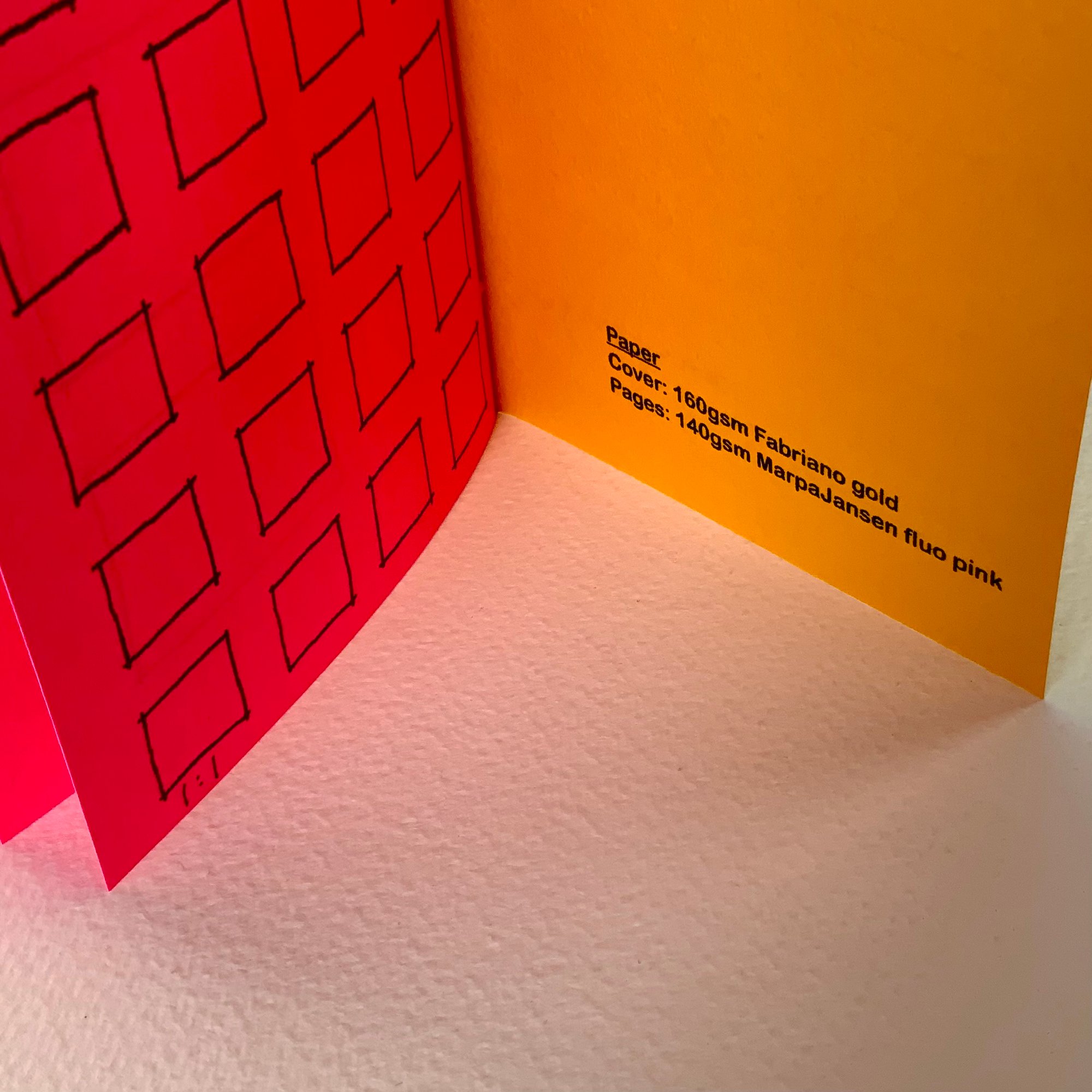 A6, 10.5 x 15cm (approx. 4 x 6") sketchbook made with 160gsm Fabriano pastel paper cover and 140gsm MarpaJensen Fluo Pink pages. Hand stitched with linen thread.