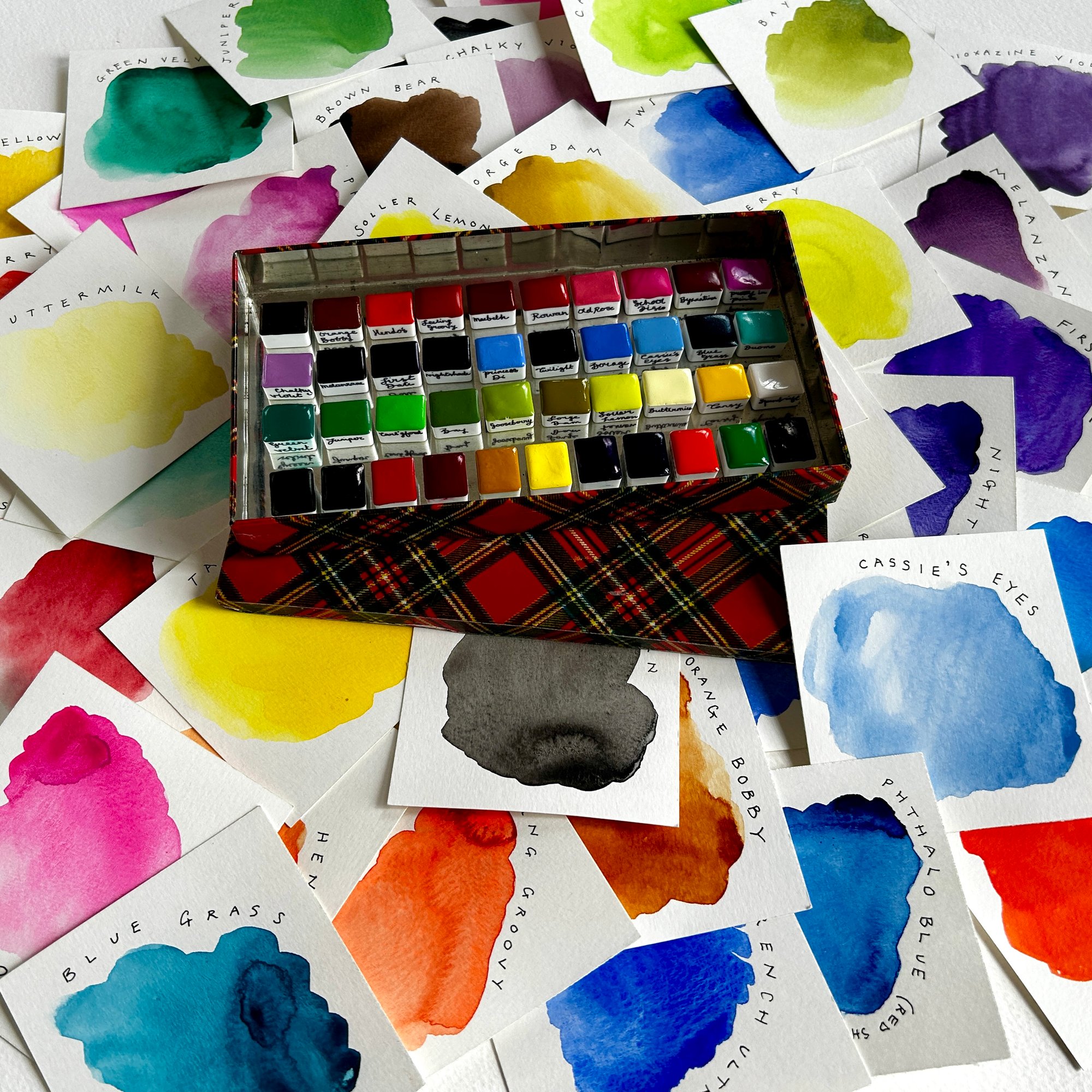 Brown Bear, Orange Bobby, Hendo’s, Feeling Groovy*, Macbeth, Rowanberry*, Old Rose, School Disco*, Byzantium*, Pretty in Pink, Chalky Violet, Melanzane, First Date, Nightshade, Princess Di, Twilight, Borage, Cassie's Eyes, Blue Grass, Duomo, Green Velvet, Juniper, Carlingford, Bay, Forge Dam, Gooseberry, Soller Lemon, Buttermilk, Tansy, Spindrift, Peppercorn, and Crozzle. Plus the primary triad of single-pigment colours Pyrrole Red, Quinacridone Red, Pyramid Yellow, Bismuth Vanadate Lemon, Phthalo Blue (Red Shade), and French Ultramarine. And our secondary colours Pyrrole Orange, Dioxazine Violet, and Permanent Green.