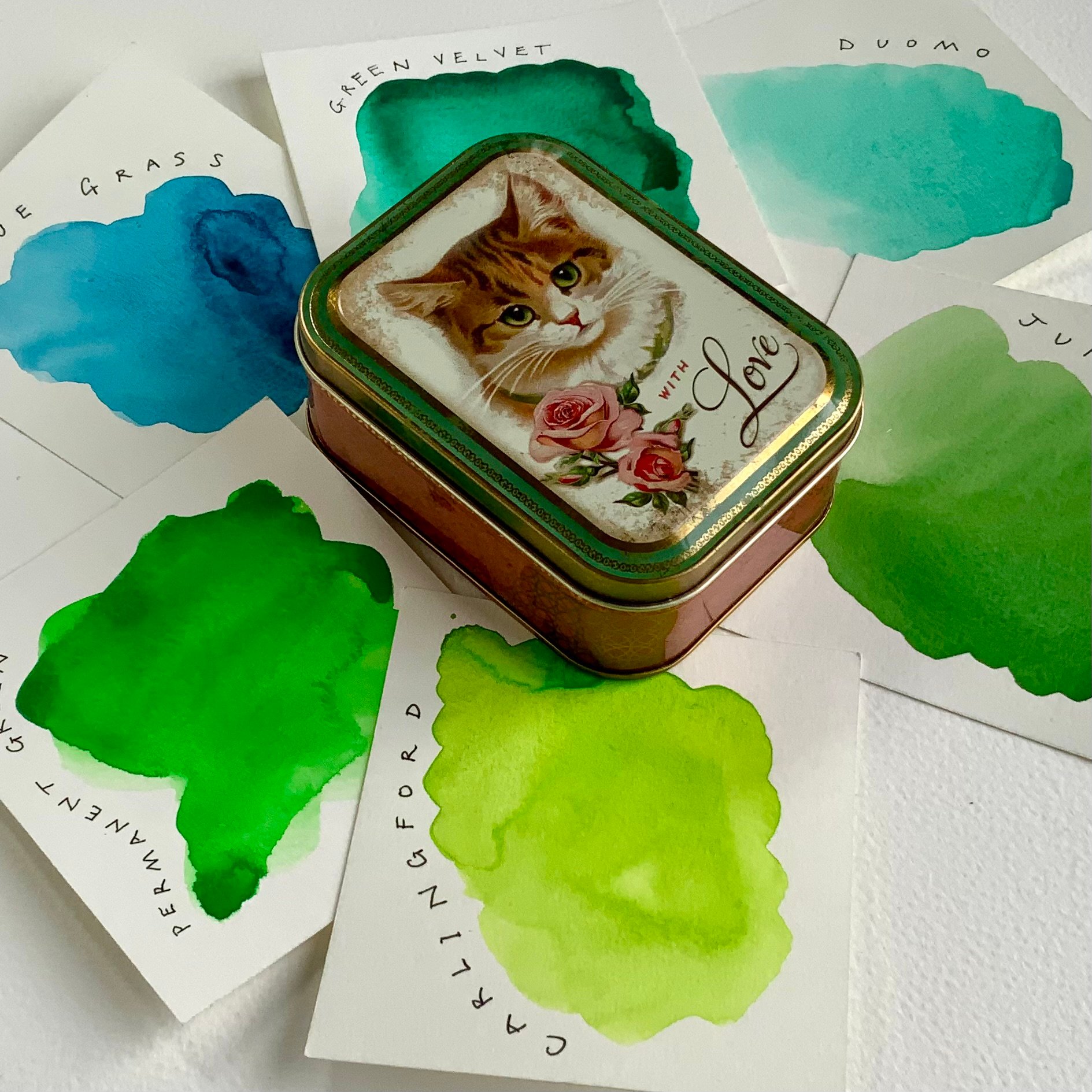 This tin contains an analogous palette of greens and blue-greens: